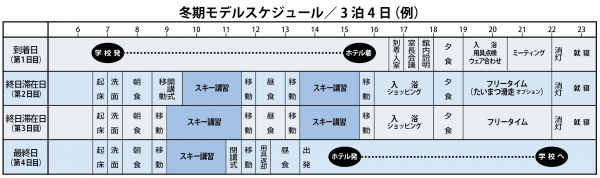 硯川ホテルが接している横手山スキー場は、スキーシーズンも長く11月下旬から5月上旬までスキーが楽しめます。良質な雪は、楽しく早く上達するために欠かせません。横手山スキー場は国内でも屈指の標高の高いところにあるため、厳しい気象条件や卓越した風景・眺望を体験できる反面、ホテルにごく近い場所に講習に適したゲレンデが広がり、団体講習に適した条件が備わっています。そのため移動時間の心配なども少なく、快適に安全にお過ごしいただけます。  スキー・スノーボードが初めての生徒さんでも2・3日で、ほとんどの生徒さんが概ね自由にゲレンデを滑り降りられるまでに上達します。経験者が多い場合や具体的な目標を設定したい場合等は、オプションの検定コースを追加していただくことで、最終日SAJ 公認検定を受ける事も可能です。そのほか360 度パノラマ展望ツアー、松明滑走、デモンストレーション、ナイタースキー等のオプションメニューも用意しております。